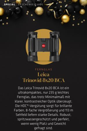 Das Leica Trinovid 8x20 BCA ist ein ultrakompaktes, nur 235 g leichtes Fernglas, das trotz Minimalmaß mit klarer, kontrastreicher Optik überzeugt. Die HDC ®-Vergütung sorgt für brillante Farben, 8-fache Vergrößerung und 113 m Sehfeld liefern starke Details. Robust, spritzwassergeschützt und perfekt, wenn wenig Platz und Gewicht gefragt sind. ca. 430 Euro, weitere Infos hier