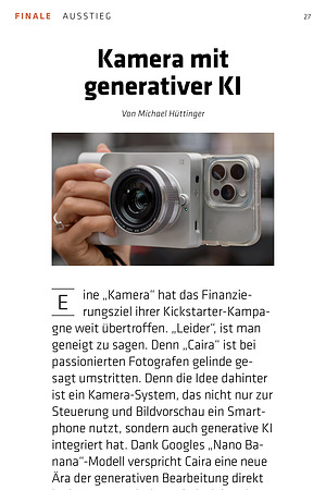 E ine „ Kamera“ hat das Finanzierungsziel ihrer Kickstarter-Kampagne weit übertroffen. „ Leider“, ist man geneigt zu sagen. Denn „ Caira“ ist bei passionierten Fotografen gelinde gesagt umstritten. Denn die Idee dahinter ist ein Kamera-System, das nicht nur zur Steuerung und Bildvorschau ein Smartphone nutzt, sondern auch generative KI integriert hat. Dank Googles „ Nano Banana“-Modell verspricht Caira eine neue Ära der generativen Bearbeitung direkt in der Kamera. So ist es beispielsweise möglich, eine Landschaft am Tag so zu verändern, dass diese aussieht, als wäre das Foto bei Nacht aufgenommen worden. Du möchtest ein Foto einer Skyline bei Nacht, mit funkelnden Lichtern? Aber keine Lust zu warten, bis die Sonne untergeht und mit Belichtungszeit und ISO experimentieren? Dann kaufe dir Caira. Einfach schnell am helllichten Tag einen Schnappschuss der Skyline machen, die KI macht den Rest. Schöne neue Fotowelt.