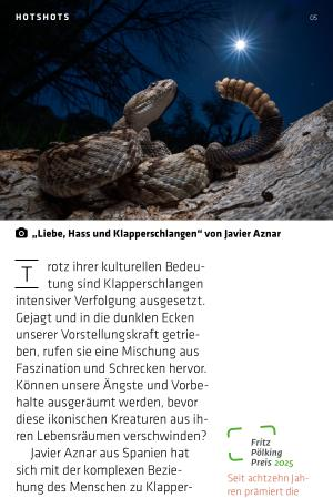 Javier Aznar aus Spanien hat sich mit der komplexen Beziehung des Menschen zu Klapperschlangen, insbesondere im amerikanischen Westen, fotografisch auseinandergesetzt und mit seiner fotografischen Story „ Liebe, Hass und Klapperschlangen“ den Fritz Pölking Preis gewonnen. Die Reportage beleuchtet die widersprüchliche Beziehung zwischen Mensch und Schlange.