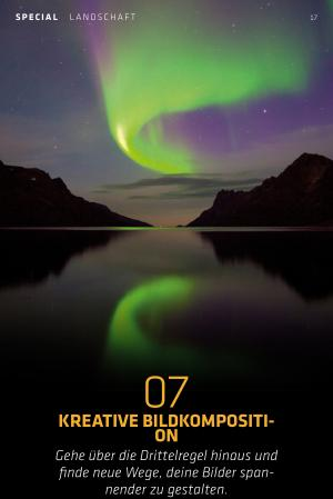 Die Anordnung der Elemente in einer Landschaftsszene muss sich nicht auf die Drittelregel. Nutze deine Kreativität, um außergewöhnliche Kompositionen zu finden. Muster, natürliche Rahmen um das Hauptmotiv oder der bewusste Einsatz von Tiefenschärfe können das Bild interessanter machen. Eine weit geöffnete Blende sorgt beispielsweise für einen unscharfen Vordergrund und verleiht dem Bild mehr Tiefe. In diesem Beispiel wurde der Horizont etwas unterhalb der Bildmitte platziert, um einen besonderen Effekt zu erzielen.