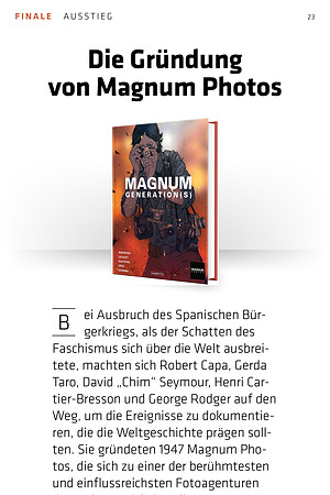 Magnum Generation( s) erzählt nun die Geschichte der Gründung. Das Buch umfasst 248 Seiten, das eine 185-seitige Graphic Novel mit einer Mischung aus Illustration und Fotografie beinhaltet und ein 73-seitiges Portfolio sowie ein 14-seitiges Dossier enthält.