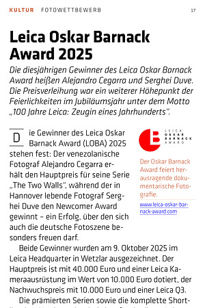 Barnack Award( LOBA) 2025 stehen fest: Der venezolanische Fotograf Alejandro Cegarra erhält den Hauptpreis für seine Serie „ The Two Walls“, während der in Hannover lebende Fotograf Serghei Duve den Newcomer Award gewinnt – ein Erfolg, über den sich