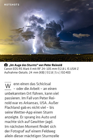 unbekannten Ort führen, kann viel passieren. Im Fall von Peter Reinold war es Arkansas, USA. Außer Flachland gab es nicht viel – bis seine Wetter-App einen Sturm anzeigte. Er sprang ins Auto und machte sich auf Gewitter-Jagd. Im nächsten Moment findet sich der Fotograf auf einem Feldweg allein dieser mächtigen Sturmzelle gegenüber und nimmt dieses beeindruckende Bild der Naturgewalt über der Kleinstadt auf. Zurecht das Siegerbild des Fotocommunity-Wettbewerbs „ Sommergeschichten“.