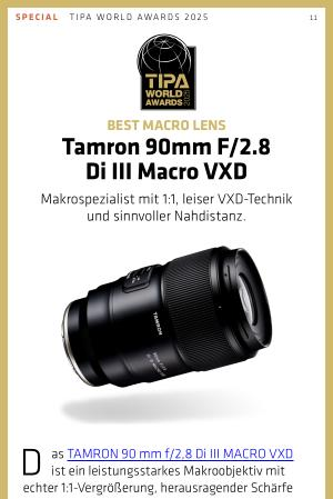 as TAMRON 90 mm f / 2, 8 Di III MACRO VXD ist ein leistungsstarkes Makroobjektiv mit echter 1:1-Vergrößerung, herausragender Schärfe und sanftem Bokeh. Sein schneller und leiser VXD- Autofokus sorgt bei Makroaufnahmen, Porträts und vielem mehr für Präzision. Mit einem Arbeitsabstand von rund 82 mm bei voller Vergrößerung ist es beispielsweise perfekt für die Fotografie von Insekten, aber auch für das Kopieren feiner Details alter Filme und Fotoabzüge geeignet. Die Blendenöffnung von f / 2,8 ist zudem ideal für schlechte Lichtverhältnisse und kreative Isolierungen – etwa bei Porträtaufnahmen. Es ist kompakt und feuchtigkeitsbeständig und bietet somit ein ausgewogenes Verhältnis zwischen Tragbarkeit und professioneller Leistung. Über den USB-C-Anschluss kann die Tamron Lens Utility verwendet werden, um Funktionen anzupassen und Firmware-Updates durchzuführen. Dieses Objektiv ist ideal für Natur-, Studio- oder Alltagsaufnahmen und bietet Vielseitigkeit und Klarheit für anspruchsvolle Kreative.