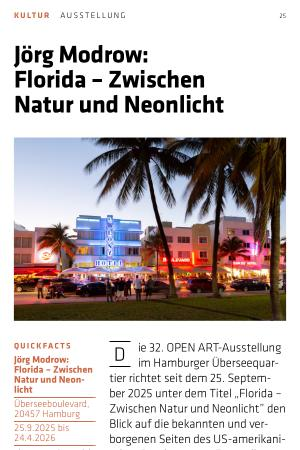 D ie 32. OPEN ART-Ausstellung im Hamburger Überseequartier richtet seit dem 25. September 2025 unter dem Titel „ Florida – Zwischen Natur und Neonlicht” den Blick auf die bekannten und verborgenen Seiten des US-amerikanischen Bundesstaats. Erstmalig präsentieren das Überseequartier und der Reiseveranstalter CRD Touristik rund 50 großformatige Aufnahmen des Hamburger Fotografen Jörg Modrow, die auf seinen zahlreichen Reportagereisen durch den Sunshine State entstanden sind. Sie zeigen Impressionen von Städten wie Miami und Fort Lauderdale, von Orlandos Themenparks und Tourismusmagneten, aber auch von fast vergessenen Orten und der wilden Natur der Everglades und der Keys. Die Bilder und Geschichten sind bis Mitte April 2026 rund um die Uhr kostenlos auf dem Überseeboulevard zugänglich.