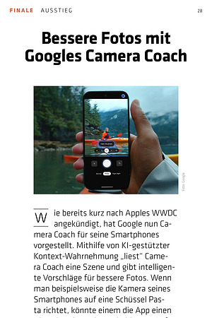 W ie bereits kurz nach Apples WWDC angekündigt, hat Google nun Camera Coach für seine Smartphones vorgestellt. Mithilfe von KI-gestützter Kontext-Wahrnehmung „ liest“ Camera Coach eine Szene und gibt intelligente Vorschläge für bessere Fotos. Wenn man beispielsweise die Kamera seines Smartphones auf eine Schüssel Pasta richtet, könnte einem die App einen Hinweis geben, einen niedrigeren Aufnahmewinkel zu wählen. Oder wenn man Berge fotografieren möchte, könnte sie vorschlagen, ein Weitwinkelobjektiv zu verwenden, um die Weite der gesamten Landschaft einzufangen. Mit der aktuellen fortschrittlichen KI kann Camera Coach die Beratung während des Fotografierens auf ein ganz neues Niveau heben. Sagen die einen. Den anderen graust es bei dem Gedanken an so viel Bevormundung bei kreativen Prozessen.
