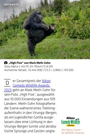geht an Mark Meth-Cohn für sein Foto „ High Five“, ausgewählt aus 10.000 Einsendungen aus 109 Ländern. Meth-Cohn fotografierte die Szene während eines Trekkingaufenthalts in den Virunga-Bergen, als ein jugendlicher Gorilla ausgelassen über eine Lichtung in den Virunga-Bergen turnte und akrobatische Sprünge und Gesten zeigte.