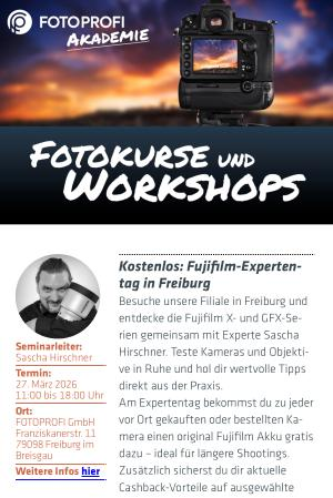 Besuche unsere Filiale in Freiburg und entdecke die Fujifilm X- und GFX-Serien gemeinsam mit Experte Sascha Hirschner. Teste Kameras und Objektive in Ruhe und hol dir wertvolle Tipps direkt aus der Praxis. Am Expertentag bekommst du zu jeder vor Ort gekauften oder bestellten Kamera einen original Fujifilm Akku gratis dazu – ideal für längere Shootings. Zusätzlich sicherst du dir aktuelle Cashback-Vorteile auf ausgewählte Kameras und Objektive. Einfach kaufen, Beleg hochladen und Geld zurückbekommen.