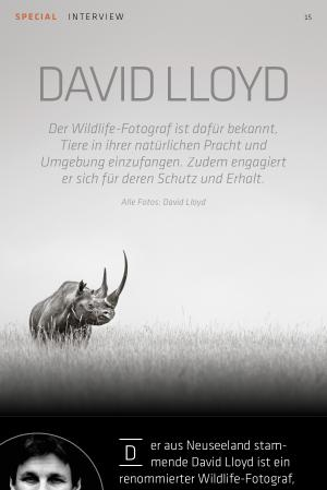 D er aus Neuseeland stam- mende David Lloyd ist ein renommierter Wildlife-Fotograf, der bereits zahlreiche Auszeichnungen wie den „ Wildlife Photographer of the Year“, den „ GDT European Wildlife Photographer of the Year“ und den „ Outdoor Photographer of the Year“ gewann. Etwa ein Drittel des Jahres verbringt Lloyd in Kenia beim Fotografieren und als Leiter von Fototouren. Wir sprechen mit ihm über seine Arbeit, was für ihn großartige Wildlife-Aufnahmen ausmachen und was es beim Fotografieren von Wildtieren zu beachten gilt.