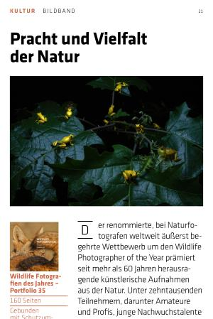 www. knesebeck-verlag. de seit mehr als 60 Jahren herausragende künstlerische Aufnahmen aus der Natur. Unter zehntausenden Teilnehmern, darunter Amateure und Profis, junge Nachwuchstalente und anerkannte Fotografen, werden Aufnahmen in unterschiedlichen Kategorien ausgewählt und der Naturfotograf des Jahres sowie sein junges Pendant ausgezeichnet. Pflanzenporträts, Unterwasserwelten, Tierfotografien oder Aufnahmen aus besonders bedrohten Gebieten der Erde geben einen umfassenden Einblick in die Bandbreite der gegenwärtigen Tier- und Landschaftsfotografie. Die besten Bilder des diesjährigen Wettbewerbs zeigt der Band Wildlife Fotografien des Jahres – Portfolio 35 – samt informativen Begleittexten, die die Entstehungsumstände