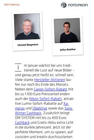 I m Januar wächst bei uns traditionell die Lust auf neue Bilder – und genau jetzt heißt es: schnell sein. Viele starke Hersteller-Aktionen laufen nur noch bis Ende des Monats. Neben dem Canon-Sofort-Rabatt mit bis zu 1.100 Euro Preisvorteil enden auch der Nikon-Sofort-Rabatt, attraktive Lumix-Sofort-Rabatte auf Kameras und Objektive sowie das Sony Winter Cashback. Zusätzlich bringt OM SYSTEM mit bis zu 400 Euro Cashback und Gratis-Akku extra Licht in die dunkle Jahreszeit. Jetzt ist der perfekte Moment, um zu sparen, aufzurüsten und kreativ durchzustarten. Komm vorbei, lass dich beraten und sichere dir die besten Winterdeals. Außerdem sind wir vom 29. Januar bis 1. Februar 2026 auf der MUNDOLOGIA in Freiburg vertreten – besuche uns im Konzerthaus, entdecke neueste Fototrends, teste aktuelle Produkte und sichere dir attraktive Messeangebote direkt am FOTOPROFI Stand. Alle Infos dazu findest Du hier. Wir freuen uns auf dich.