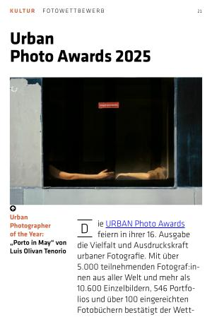 D ie URBAN Photo Awards feiern in ihrer 16. Ausgabe die Vielfalt und Ausdruckskraft urbaner Fotografie. Mit über