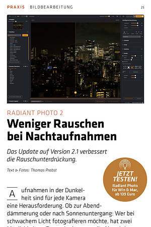 Radiant Photo für Win & Mac, ab 139 Euro eine Herausforderung. Ob zur Abenddämmerung oder nach Sonnenuntergang: Wer bei schwachem Licht fotografieren möchte, hat zwei Möglichkeiten. Entweder hat man die Abend- bzw. Nachtaufnahmen vorab sorgfältig geplant, hat ein stabiles Dreibeinstativ dabei und kann somit bei niedriger ISO-Empfindlichkeit länger belichten. Oder es handelt sich um eine spontane Aufnahmesituation, in der kein Stativ vorhanden ist. In dem Fall muss die ISO-Empfindlichkeit so weit erhöht werden, bis die Verschlusszeiten kurz genug sind, um scharfe Aufnahmen aus der freien Hand zu machen.