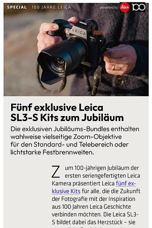 Kamera präsentiert Leica fünf exklusive Kits für alle, die die Zukunft der Fotografie mit der Inspiration aus 100 Jahren Leica Geschichte verbinden möchten. Die Leica SL3- S bildet dabei das Herzstück – sie ermöglicht Produktionen mit professionellem Anspruch in einer bisher unerreichten Geschwindigkeit und vereint diese Leistung mit funktionalem Design.
