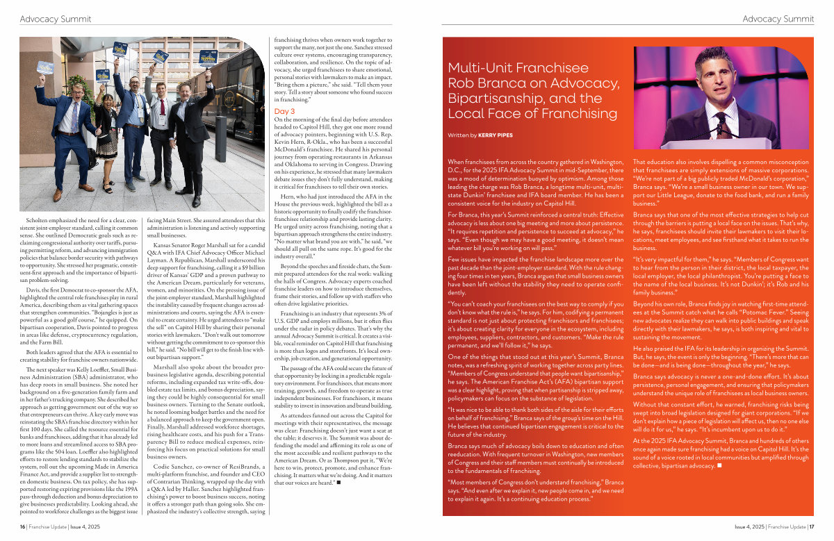 As attendees fanned out across the Capitol for meetings with their representatives, the message was clear: Franchising doesn’ t just want a seat at the table; it deserves it. The Summit was about defending the model and affirming its role as one of the most accessible and resilient pathways to the American Dream. Or as Thompson put it,“ We’ re here to win, protect, promote, and enhance franchising. It matters what we’ re doing. And it matters that our voices are heard.” •