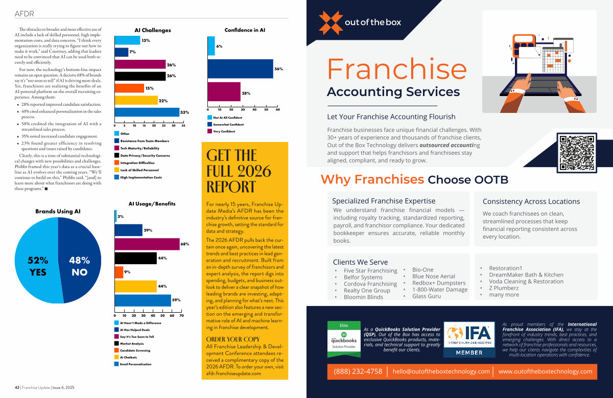 Franchise businesses face unique financial challenges. With 30 + years of experience and thousands of franchise clients, Out of the Box Technology delivers outsourced accounting and support that helps franchisors and franchisees stay aligned, compliant, and ready to grow.
