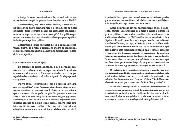 A reciprocidade, que a fraternidade implica, assume então o aspecto de um direito-dever, que tem seu fundamento na moral entendida“ como conjunto de leis que comandam incondicionalmente e segundo as quais devemos agir”; 55 leis práticas que, mesmo em seu caráter puro e teorético, são regras para a prática, inclusive para a prática política.