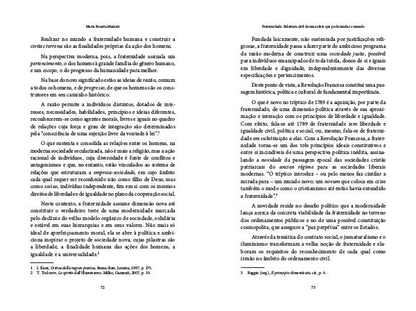 Neste contexto, a fraternidade assume dimensão nova até constituir o verdadeiro teste de uma modernidade marcada pelo declínio do velho modelo orgânico de sociedade, solidária e estável em suas hierarquias e em seus valores. Não mais só ideal de aperfeiçoamento moral, ela se abre à política e ambiciona inspirar o projeto de sociedade nova, cujas pilastras são a liberdade, a finalidade humana das ações dos homens, a igualdade e a universalidade. 2