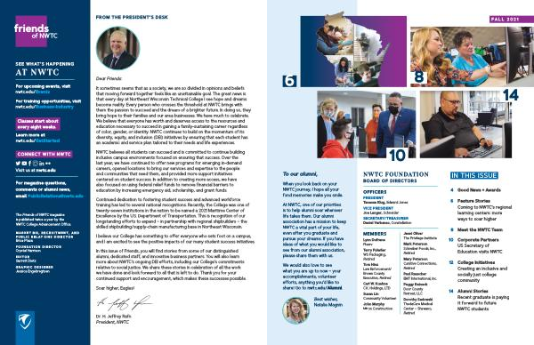 In this issue of Friends , you will find stories from some of our distinguished alumni , dedicated staff , and innovative business partners . You will also learn more about NWTC ’ s ongoing DEI efforts , including our College ’ s commitments relative to social justice . We share these stories in celebration of all the work we have done and look forward to all that is left to do . Thank you for your continued support and encouragement , which makes these successes possible .