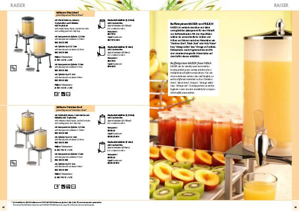 The bases of the RAISER juice dispensers and PURE NATURE Milk Dispensers (page 50) of the same size are interchangeable.