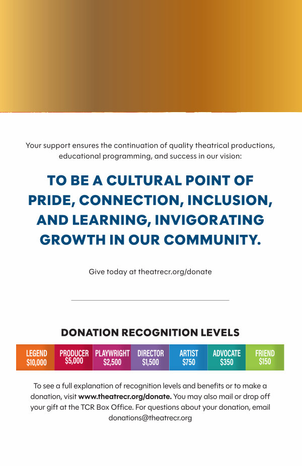 To see a full explanation of recognition levels and benefits or to make a donation, visit www. theatrecr. org / donate. You may also mail or drop off your gift at the TCR Box Office. For questions about your donation, email donations @ theatrecr. org