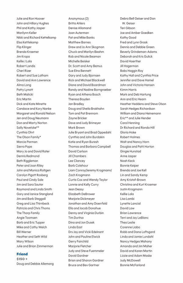 Anonymous( 2) Britta Ahlers Denise Allamand Joan Auterman Pat and Mike Banks Matthew Barnes Drew and Jo Ann Skogman Chuck and Marilyn Beahm Rob and Nicole Beaman Michelle Beisker Dr. Scott and Amy Bemus Sue Elna Bennett Gary and Judy Bjornsen Rick and Michael Blackwell Diane and David Boardman Randy and Nadine Borngraeber Ryan and Athena Bosch Theresa Boyden Jan Bradley Doug and Sheila Brakhahn Tom and Pat Brennom Zayne Bricker Dave and Judy Brimeyer Mark Brown Julie Bryant and Brad Oppedahl Cynthia and John Burdakin Katie and Ryan Buresh Thomas and Barbara Campbell David Carlson Jill Chambers Lee Clancey Barb Colehour Liam Conroy / Jeremy Krogmann / Zach Krogmann Curtis Cox and Wendy Taylor Lonnie and Kelly Curry Jean Deasy Elizabeth DeBrower Marjorie Dickmeyer Jonathan and Amy Doerrfeld Ella and Jacob Donohue Denny and Virginia Durbin Tim Duritsa Dina and Jon Dusek Linda East Drs Jay and Vicki Edelnant John and Pauline Elwick Gerry Fairchild Marjorie Fletcher Judy and Steve Fuemmeler David Gardner Brian and Sharon Gardner Bruce and Bev Gartner