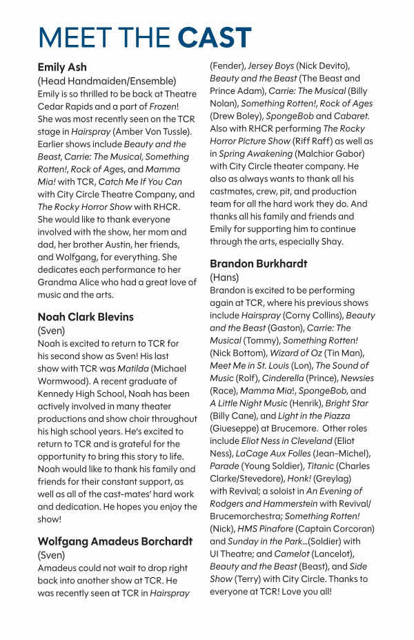 Emily Ash( Head Handmaiden / Ensemble) Emily is so thrilled to be back at Theatre Cedar Rapids and a part of Frozen! She was most recently seen on the TCR stage in Hairspray( Amber Von Tussle). Earlier shows include Beauty and the Beast, Carrie: The Musical, Something Rotten!, Rock of Ages, and Mamma Mia! with TCR, Catch Me If You Can with City Circle Theatre Company, and The Rocky Horror Show with RHCR. She would like to thank everyone involved with the show, her mom and dad, her brother Austin, her friends, and Wolfgang, for everything. She dedicates each performance to her Grandma Alice who had a great love of music and the arts.