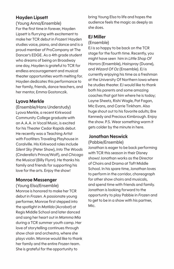 Monroe Messenger( Young Elsa / Ensemble) Monroe is honored to make her TCR debut in Frozen. A passionate young performer, Monroe first stepped into the spotlight in Matilda( Acrobat) at Regis Middle School and later danced and sang her heart out in Mamma Mia during a TCR summer youth camp. Her love of storytelling continues through show choir and orchestra, where she plays violin. Monroe would like to thank her family and the entire Frozen team. She is grateful for the opportunity to bring Young Elsa to life and hopes the audience feels the magic as deeply as she does.