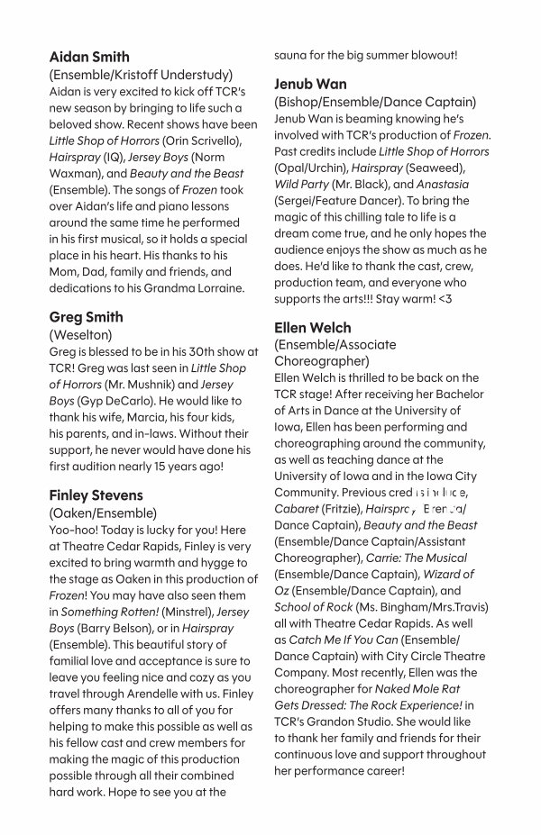 Finley Stevens( Oaken / Ensemble) Yoo-hoo! Today is lucky for you! Here at Theatre Cedar Rapids, Finley is very excited to bring warmth and hygge to the stage as Oaken in this production of Frozen! You may have also seen them in Something Rotten!( Minstrel), Jersey Boys( Barry Belson), or in Hairspray( Ensemble). This beautiful story of familial love and acceptance is sure to leave you feeling nice and cozy as you travel through Arendelle with us. Finley offers many thanks to all of you for helping to make this possible as well as his fellow cast and crew members for making the magic of this production possible through all their combined hard work. Hope to see you at the sauna for the big summer blowout!