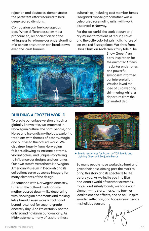 To create our unique version of such a globally known title, we immersed in Norwegian culture, the Sami people, and Norse and Icelandic mythology, exploring traditions with themes of destiny, magic, and our ties to the natural world. We also drew heavily from Norwegian folk art, allowing its intricate patterns, vibrant colors, and unique storytelling to influence our designs and costumes. Our own state’ s Vesterheim Norwegian- American Museum in Decorah and its collections serve as source imagery for many elements of the design.