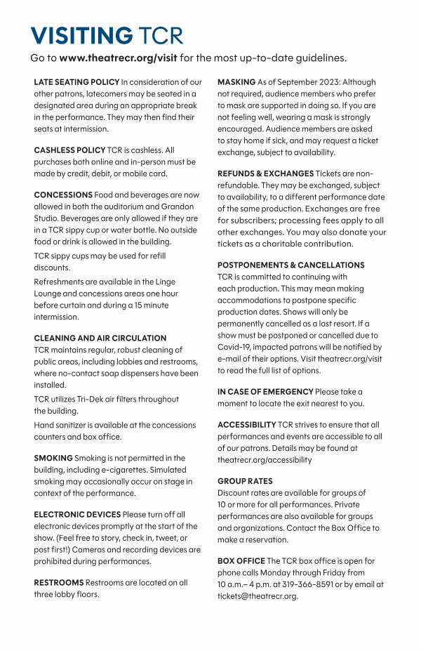 ACCESSIBILITY TCR strives to ensure that all performances and events are accessible to all of our patrons. Details may be found at theatrecr. org / accessibility