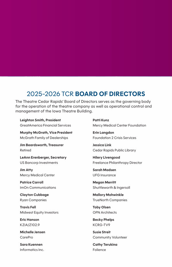The Theatre Cedar Rapids’ Board of Directors serves as the governing body for the operation of the theatre company as well as operational control and management of the Iowa Theatre Building.