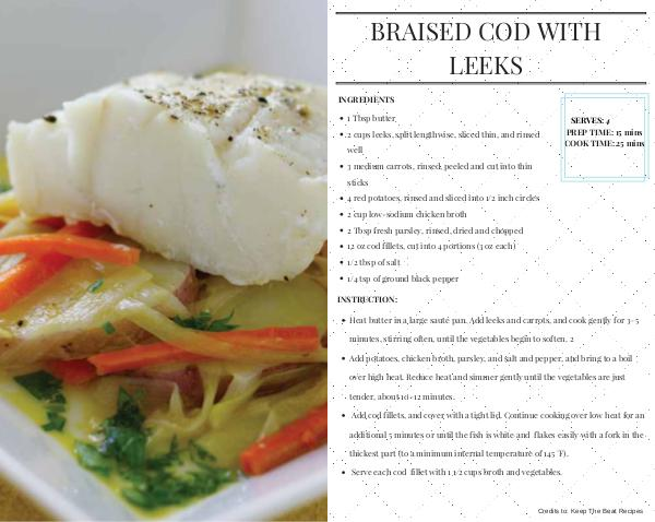 Heat butter in a large sauté pan. Add leeks and carrots, and cook gently for 3 – 5 minutes, stirring often, until the vegetables begin to soften. 2 Add potatoes, chicken broth, parsley, and salt and pepper, and bring to a boil over high heat. Reduce heat and simmer gently until the vegetables are just tender, about 10 – 12 minutes. Add cod fillets, and cover with a tight lid. Continue cooking over low heat for an additional 5 minutes or until the fish is white and flakes easily with a fork in the thickest part( to a minimum internal temperature of 145 ° F). Serve each cod fillet with 1 1 ⁄ 2 cups broth and vegetables.
