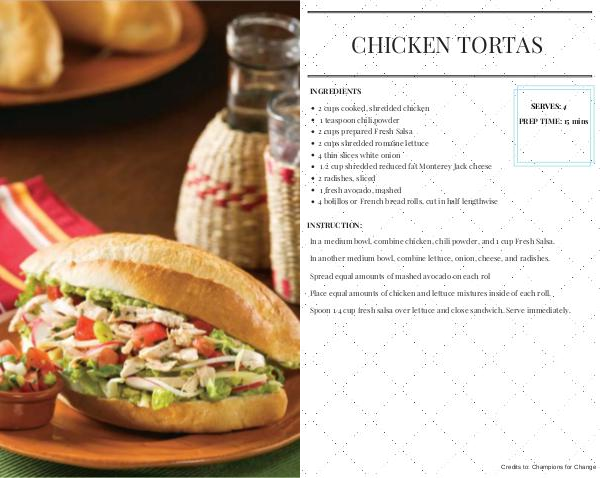 2 cups cooked, shredded chicken 1 teaspoon chili powder 2 cups prepared Fresh Salsa 2 cups shredded romaine lettuce 4 thin slices white onion 1 ⁄ 2 cup shredded reduced fat Monterey Jack cheese 2 radishes, sliced 1 fresh avocado, mashed 4 bolillos or French bread rolls, cut in half lengthwise