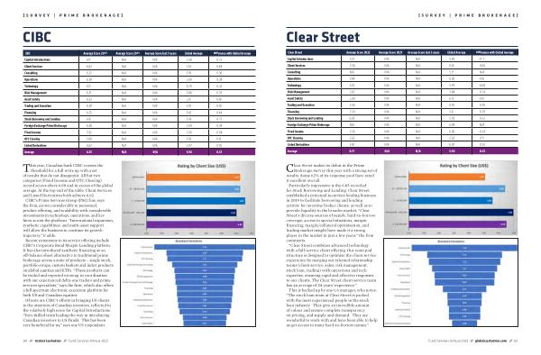 This year , Canadian bank CIBC crosses the threshold for a full write up with a set of results that do not disappoint . All but two categories ( Fixed Income and OTC Clearing ) record scores above 6.00 and in excess of the global average . At the top end of the table , Client Services and Listed Derivatives both achieve 6.62 . CIBC ’ s Prime Services Group ( PSG ) has , says the firm , grown considerably in personnel , product offering , and scalability with considerable investments in technology , operations , and key hires across the platform . “ International expansion , synthetic capabilities , and multi-asset support will allow the business to continue its growth trajectory ,” it adds . Recent extensions to its service offering include CIBC ’ s Corporate Bond Margin Lending platform . It has also introduced synthetic financing as an off-balance sheet alternative to traditional prime brokerage across a suite of products – single stock , portfolio swaps , custom baskets and index products on global equities and ETFs . “ These products can be traded and reported on swap , in coordination with our experienced delta-one traders and prime services specialists ,” says the firm , which also offers a full spectrum electronic execution platform for both US and Canadian equities . Of note are CIBC ’ s efforts in bringing US clients to the attention of Canadian investors , reflected in the relatively high score for Capital Introductions . “ Very skilled team leading the way in introducing Canadian investors to US Funds . This has been very beneficial for us ,” says one US respondent .
