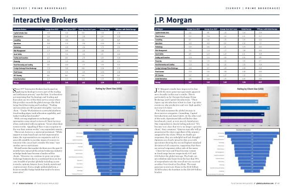 J . P . Morgan Average Score 2022 Average Score 2021 Average Score last 3 years Global Average Difference with Global Average Capital Introductions 5.62 4.81 5.02 5.38 0.24 Client Services 5.57 5.58 5.42 6.14 -0.57 Consulting 6.17 5.92 5.76 5.91 0.26 Operations 4.69 4.69 4.81 6.00 -1.31 Technology 5.54 5.05 5.12 5.79 -0.25 Risk Management 5.82 5.20 5.27 5.88 -0.06 Asset Safety 6.19 6.29 6.24 6.15 0.04 Trading and Execution 5.78 5.23 5.42 6.19 -0.41 Financing 5.60 5.74 5.63 5.81 -0.21 Stock Borrowing and Lending 5.59 5.61 5.65 5.93 -0.34 Foreign Exchange Prime Brokerage 6.00 4.71 5.24 6.04 -0.04 Fixed Income 5.50 5.43 5.48 6.00 -0.50 OTC Clearing 5.67 6.15 6.07 5.92 -0.25 Listed Derivatives 5.65 5.60 5.75 6.07 -0.42 Average 5.67 5.43 5.49 5.94 -0.27