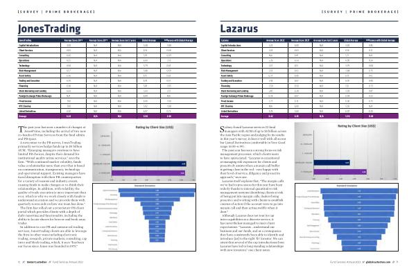 JonesTrading Average Score 2022 Average Score 2021 Average Score last 3 years Global Average Difference with Global Average Capital Introductions 3.50 N / A N / A 5.38 -1.88 Client Services 6.82 N / A N / A 6.14 0.68 Consulting 6.00 N / A N / A 5.91 0.09 Operations 6.55 N / A N / A 6.00 0.55 Technology 6.44 N / A N / A 5.79 0.65 Risk Management 6.57 N / A N / A 5.88 0.69 Asset Safety 6.80 N / A N / A 6.15 0.65 Trading and Execution 6.70 N / A N / A 6.19 0.51 Financing 6.86 N / A N / A 5.81 1.05 Stock Borrowing and Lending 6.50 N / A N / A 5.93 0.57 Foreign Exchange Prime Brokerage N / A N / A N / A 6.04 N / A Fixed Income 7.00 N / A N / A 6.00 1.00 OTC Clearing 7.00 N / A N / A 5.92 1.08 Listed Derivatives 6.80 N / A N / A 6.07 0.73 Average 6.42 N / A N / A 5.94 0.48