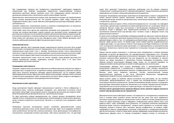 Однако попытка вызвать сочувствие и, в конечном итоге, неподчинение в силовых структурах диктаторов не должно восприниматься, как подстрекательство вооруженных сил к быстрому свержению существующей диктатуры путем военного переворота. При таком сценарии едва ли возникнет жизнеспособная демократия( как уже говорилась), так как переворот не изменит баланса сил между населением и правителями. Поэтому необходимо спланировать, каким образом заставить сочувствующих офицеров армии понять, что ни военный переворот, ни гражданская война против диктатуры не являются необходимыми или желательными.