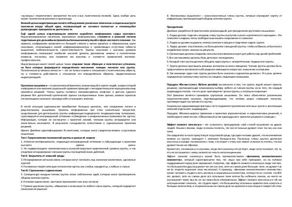 В такой ситуации единомыслие приобретает большую ценность, чем следование логике и рациональному мышлению. Уровень конформизма при этом значительно возрастает, существенная для деятельности группы информация подвергается тенденциозному толкованию, культивируется неоправданный оптимизм и убеждение в неограниченных возможностях группы. Информация, которая не согласуется с принятой линией, членами группы игнорируется или значительно искажается. В результате складывается впечатление о единогласном принятии решений.