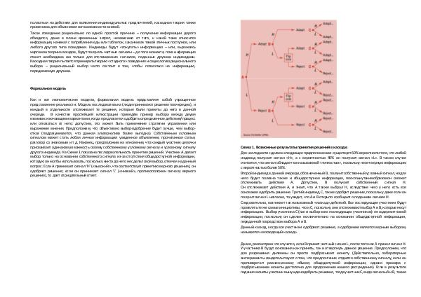 Как и все экономические модели, формальная модель представляет собой упрощенное представление реальности. Модель последовательна( люди принимают решения поочередно), и каждый в отдельности отслеживает те решения, которые были приняты до него в данной очереди. В качестве простейшей иллюстрации приведём пример выбора между двумя взаимоисключающими вариантами, когда предлагается одобрить определенное действие / процесс или отказаться от него: допустим, это может быть применение стратегии управления или выражение мнения. Предположим, что объективно выбор-одобрение будет лучше, чем выборотказ( подразумевается, что данная альтернатива более выгодна). Собственным условным сигналом может стать любая личная информация: увиденное объявление, прочитанная статья, разговор со знакомым и т. д. Наконец, предположим на мгновение, что каждый участник цепочки присваивает одинаковую важность своему собственному условному сигналу и условному сигналу другого индивида. На Схеме 1 показана последовательность принятия решений. Участник А делает выбор только на основании собственного сигнала из-за отсутствия общедоступной информации, которую он мог бы использовать, поскольку никто до него не сделал свой выбор, отвечая на данный вопрос. Если А принимает сигнал‘ H’(« высокий », что соответствует принятию верного решения), он одобряет решение; если он принимает сигнал‘ L’(« низкий », противоположен сигналу верного решения), то дает отрицательный ответ.