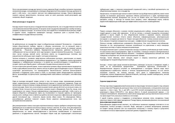 Каскады играют такую же роль в государственном вмешательстве, как и государственная политика в отслеживании мнения большинства. В лучшем случае государство вмешивается в выбор человека, опираясь на верные каскады – во всяком случае, они корректны в понимании большинства людей. В худшем случае, государство превращает каскады, лишенные цели и научной базы, в неэффективную государственную политику.
