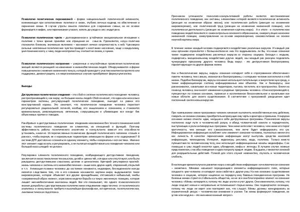 Психология политического настроения – умеренные и неустойчивые проявления политических эмоций являются реакцией на изменения в жизнеобеспечении людей. Обнаруживаются в форме повышения или снижения жизненного тонуса, который приводит к участию в митингах протеста или поддержки, демонстрациях, а в неорганизованных случаях приобретают форму хулиганства.