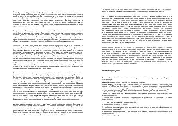 Живя в человеческом социуме, человек постоянно подвергается воздействию коллективных программ, связанных с рассовой, национальной, религиозной, клановой структурой сознания. Совпадение устремлений и помыслов объединяет их в определенные эгрегоры. Особенно выраженным действием коллективных вирусов является проявление расизма, национальной ненависти, распространение терроризма. В религиозном плане проявление вирусов сознания проявляется в виде актов массовых самосожжений, терактов, войн против неверных. Мощным инструментом для их распространения являются культура, искусство, а также средства массовой информации и Интернет( технологии high-hume). Это демонические изображения, агрессивная музыка и реклама, это различные пситехнологии, внедренные часто на подсознательном уровне. « Эти негативные представления и идеи, зараженные вирусом, с такой же силой влияют на наше поведение, как и те, которые внушаются объекту гипноза профессиональным гипнотизером ».( 1). Эффект « 25 кадра »- это наглядный пример распространения вирусов сознания. Техники программирования, такие как NLP- мощный инструмент для управления человеческой психикой. Внедренные в подсознание, они влияют на поступки людей и меняют жизненные программы.