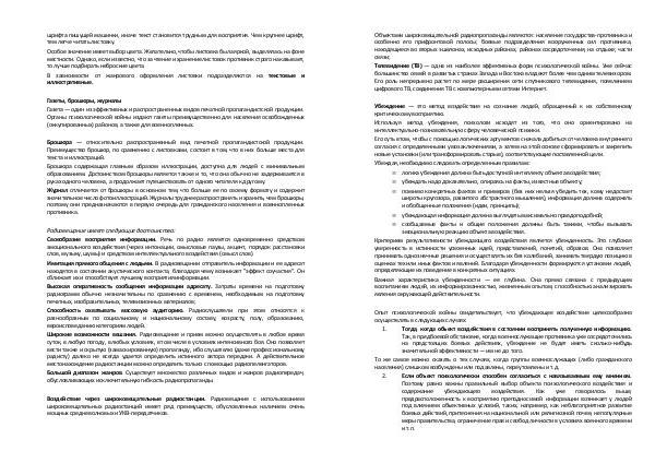 2. Если объект психологически способен согласиться с навязываемым ему мнением. Поэтому равно важны правильный выбор объекта психологического воздействия и содержание убеждающего воздействия. Как уже говорилось выше, предрасположенность к восприятию преподносимой информации возникает у людей под влиянием объективных условий, таких, например, как неблагоприятное развитие боевых действий, притеснения на национальной или религиозной почве, непопулярные меры правительства, ограничение прав и свобод личности в условиях военного времени и т. п.
