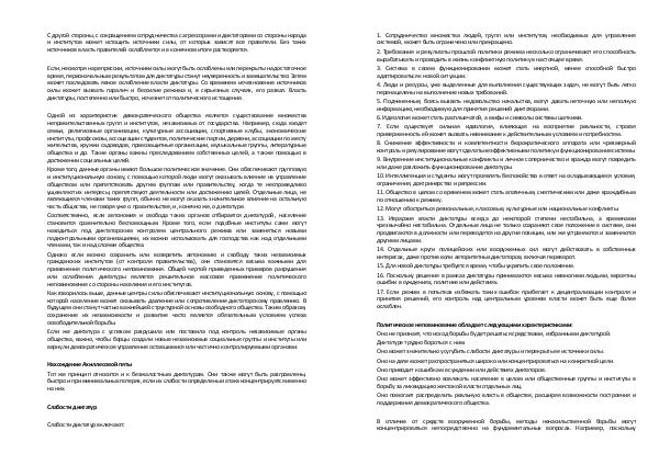 Однако если можно сохранить или возвратить автономию и свободу таких независимых гражданских институтов( от контроля правительства), они становятся весьма важными для применения политического неповиновения. Общей чертой приведенных примеров разрушения или ослабления диктатуры является решительное массовое применение политического неповиновения со стороны населения и его институтов.