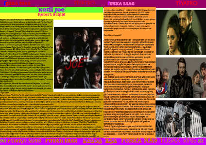 Daha sonraki bir oyunuyla Pulitzer Ödülü'nü de almış olan oyuncu/yazar Tracy Letts'in ilk sahne yapıtı olan "Killer Joe"ya ilk kez bundan 10-12 yıl önce Aleks Sierz'in "In-Yer-Face-Theatre" kitabında (Selin Girit'in çevirisiyle: "Suratına Tiyatro"; Mitos-Boyut Yay., 2009) rastlamıştım. Orada konunun A.B.D.'nin "yoksul beyaz alt tabakası"nı oluşturan bir aile ile annelerini öldürmek için tuttukları kiralık katil arasında geliştiğini öğrenmiş ve baba, üvey anne ile çocukların çaresizlik/umutsuzluk/ahlaksızlık üçgeni arasında bocaladığını okumuştum; oyunun sonu da (anladığım kadarıyla) birazcık "Shakespeare'yen" boyutlara çalıyordu... Gene Sierz'in aktardığı kadarıyla, ortam ve kişiler W.Faulkner/T.Williams/S.Peckinpah'ın roman/oyun/filmlerini andırıyor ve oyun hakkında yazdığı ilk satırlarda yer alan Letts hakkında "...Britanya izleyicisine polisiye bir gerilim izlemek için sinemaya gitmek zorunda olmadıklarını hatırlatıyor..." yorumu ilgimi çekmişti.