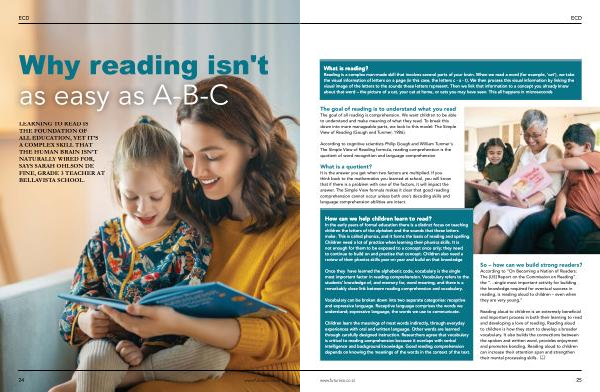 LEARNING TO READ IS THE FOUNDATION OF ALL EDUCATION, YET IT’ S A COMPLEX SKILL THAT THE HUMAN BRAIN ISN’ T NATURALLY WIRED FOR, SAYS SARAH OHLSON DE FINE, GRADE 3 TEACHER AT BELLAVISTA SCHOOL.