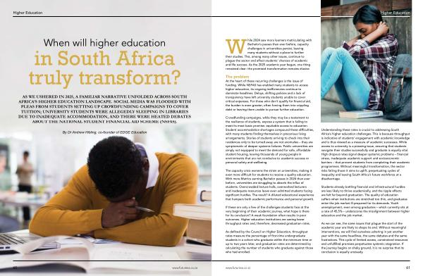 AS WE USHERED IN 2025, A FAMILIAR NARRATIVE UNFOLDED ACROSS SOUTH AFRICA’ S HIGHER EDUCATION LANDSCAPE. SOCIAL MEDIA WAS FLOODED WITH PLEAS FROM STUDENTS SETTING UP CROWDFUNDING CAMPAIGNS TO COVER TUITION; UNIVERSITY STUDENTS WERE ALLEGEDLY SLEEPING IN LIBRARIES DUE TO INADEQUATE ACCOMMODATION, AND THERE WERE HEATED DEBATES ABOUT THE NATIONAL STUDENT FINANCIAL AID SCHEME( NSFAS).