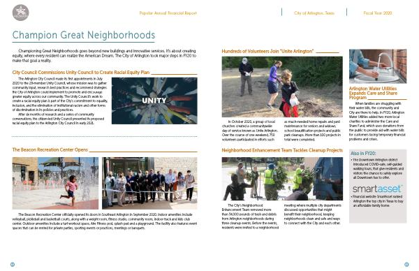 Championing Great Neighborhoods goes beyond new buildings and innovative services . It ’ s about creating equity , where every resident can realize the American Dream . The City of Arlington took major steps in FY20 to make that goal a reality .