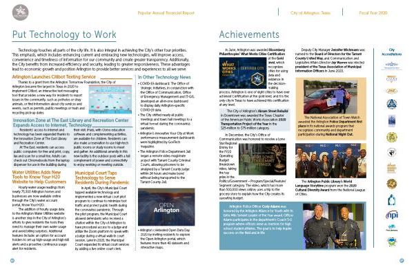 Technology touches all parts of the city life . It is also integral in achieving the City ’ s other four priorities . This emphasis , which includes enhancing current and embracing new technologies , will improve access , convenience and timeliness of information for our community and create greater transparency . Additionally , the City benefits from increased efficiency and security , leading to greater responsiveness . These advantages lead to economic growth and position Arlington to provide better services and experiences to all we serve .